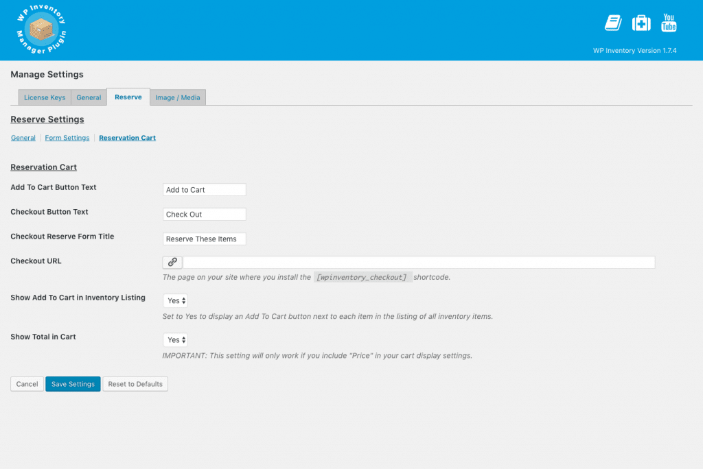 - Specify the Checkout URL in the Reservation Cart settings under the Reserve tab in your WP Inventory settings.